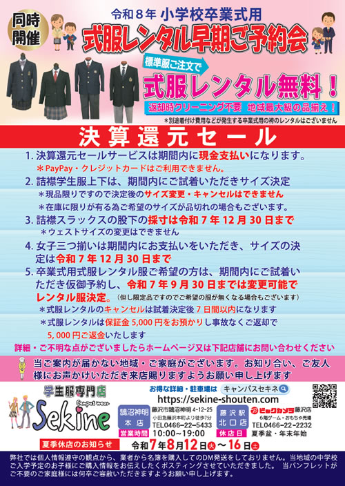 学生服専門店sekine|生活応援 決算還元セール!8月31日(日)まで