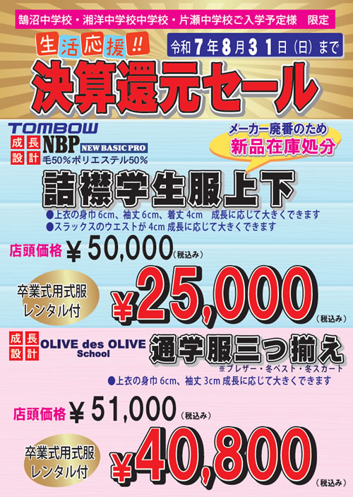 学生服専門店sekine|生活応援 決算還元セール!8月31日(日)まで