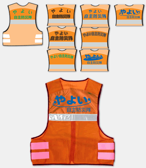 やよい自主防災の防災ベストです。8種類のデザインをご提案致しました。